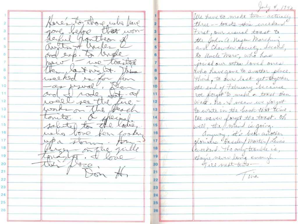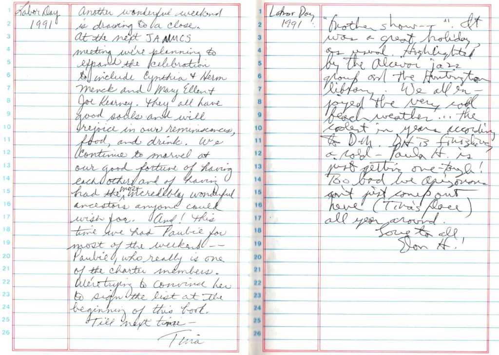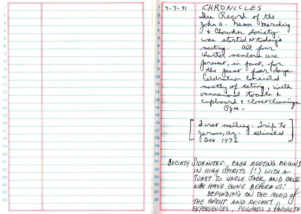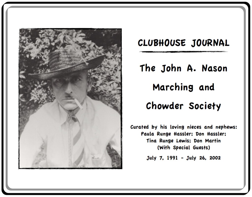 On July 7, 1991, in my apartment in Marina del Rey, Don Martin, Tina Lewis, Don Hassler, and Paula Hassler, signed as charter members of the John A. Nason Marching & Chowder Society. The first meeting was held in memory of Bill Irving, Jack Nason, Melvin Leahy, Ella Runge, Warren Taylor, Martin Runge, Martha Martin, Marie Leahy, Merwin Martin. I’m not sure why they were listed in that order; perhaps in the order of when they died.